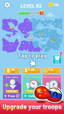 Try to win and collect the coins to level up, accelerate the producing speed and marching speed