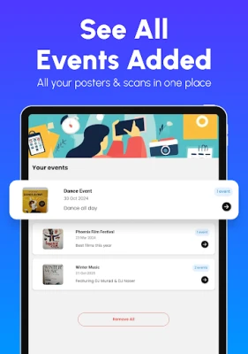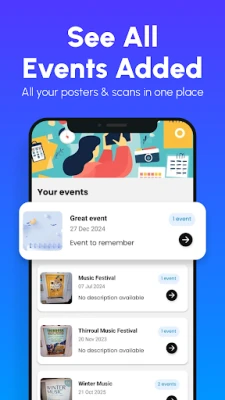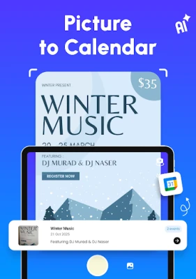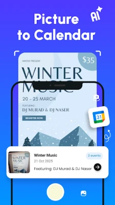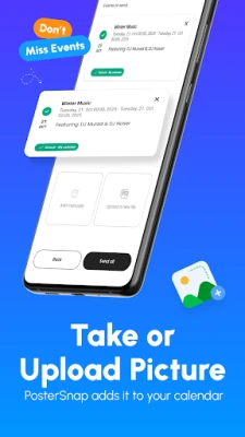 Snap a photo or upload images of posters, and timetables, and let PosterCal extract the details such as dates and event names, and add them to your digital calendars - one or many! Our cutting-edge AI instantly extracts and adds events to your digital calendar. Whether it's your work schedule, family planner, or class timetable, PosterSnap keeps every detail in one place so you stay on top of your day—effortlessly and stress-free.