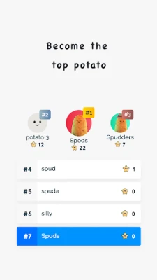 + Choose your favourite potato + Give your potato a name + Feed your potato + Bath your potato + Give your potato exercise + Give your potato a room + Customize your room + Play mini-games + Invite your friends and co-parent your potato together