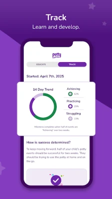 • Develop skills with milestones: Each milestone contains a multitude of skills for your child to learn, like prioritizing potty breaks, communicating when they are done, and going potty without assistance from an adult.
