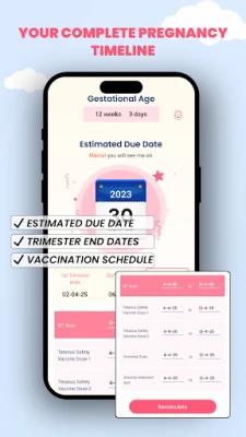 Track critical pregnancy milestones: NT Scan, Anomaly Scan, Glucose Test, Tetanus Vaccine Schedule, and trimester changes.