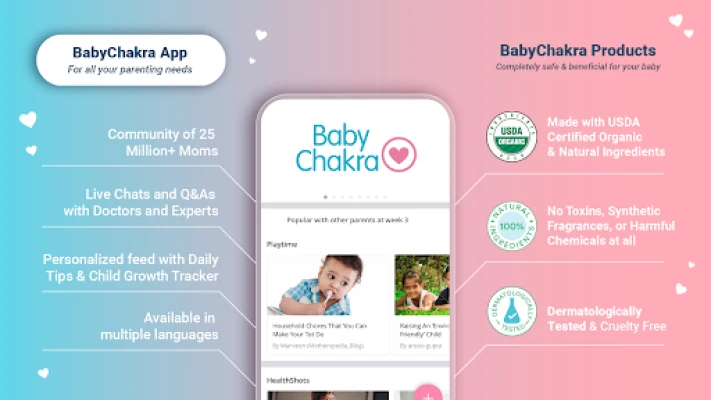 BabyChakra is India's largest parenting & pregnancy care app. It’s a one-stop destination for pregnant women, new parents, and parents of toddlers.It has 100% Certified Baby Safe baby products, week-by-week pregnancy tips, personalized advice, pregnancy calculator, live video chat with doctors & more. Millions of mothers trust BabyChakra & the app is used by moms from all over the world. A highly skilled team of Experts & Doctors handle every element of Pregnancy & Parenting at BabyChakra.