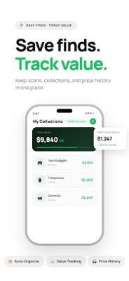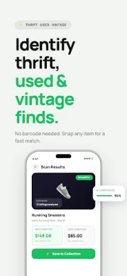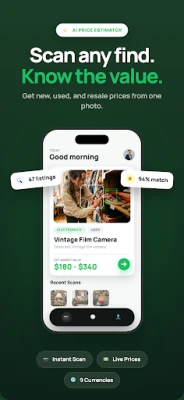 Point your camera at an item, tap scan, and get accurate new and used price ranges with a confidence rating. Use it for thrift store finds, garage sales, flea markets, estate sales, collectibles, clothing, electronics, furniture, and more. No barcode required.