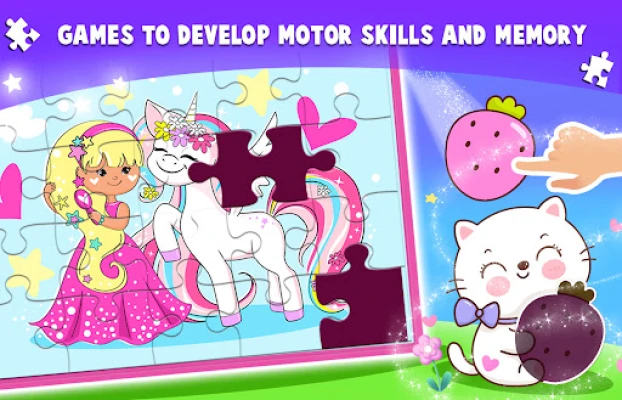 Train your brain, improve memory, and develop motor skills while solving beautiful princess jigsaw puzzles, unicorn puzzles, shadow matching, and coloring book pages. Perfect for girls of all ages!