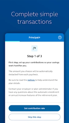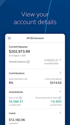 • Complete simple transactions and quick check-ins: view account balances, roll over funds, change contributions, adjust investments, and more