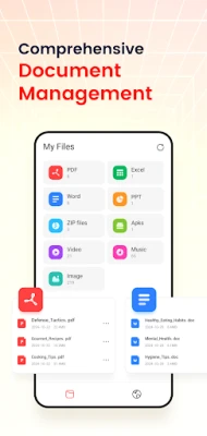 Manage your files anytime and anywhere, including deleting and sharing nine types of files on your phone: PDF, Excel, Word, PPT, ZIP, APK, videos, music, and images.