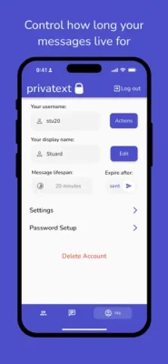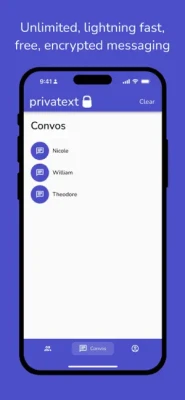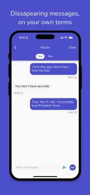 Chat with anyone with Privatext about anything you want. Lock the app so only you can enter it. Each message you send has an adjustable lifespan that automatically erases whenever you want, from 30 seconds to 24 hours. Clear and delete whole messaging histories from your phone, your contact’s phone and Privatext servers with just one click. Every encoded message is wiped instantly, and kept private and for your eyes only.