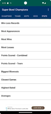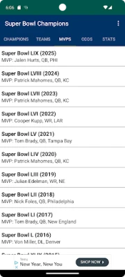 * Quickly look up any Super Bowl Champion and score result – no more scratching your head, who won Super Bowl VII?