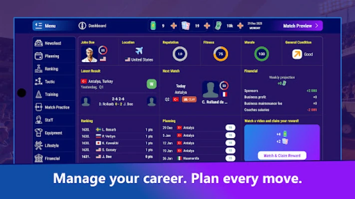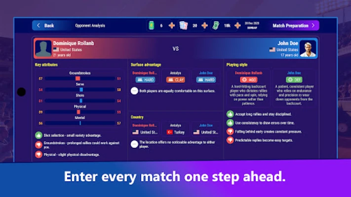 Build a professional tennis team to support your career. Hire coaches to improve player development and bring in an analyst to unlock advanced tennis match analysis, performance reports, and deeper strategic insights. Staff management plays a key role in long-term success in this tennis manager game.