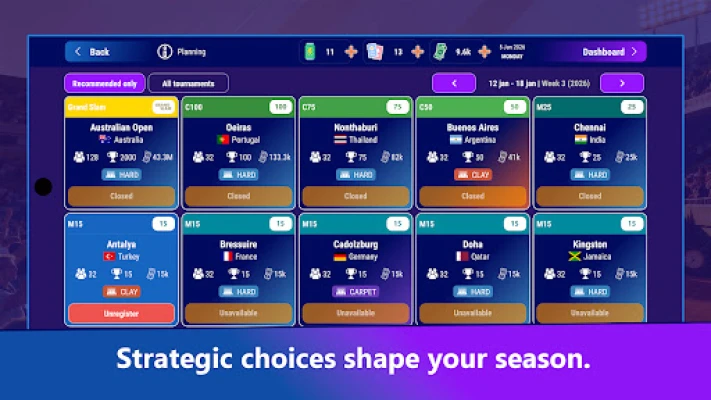 Pro Tennis Tour 26 is a tennis manager game and tennis career simulation where you create your own tennis player and manage every part of a professional tennis career. Plan training, manage energy, choose tournaments, and climb the world rankings in a deep tennis management simulation designed for long-term progression.