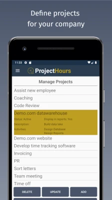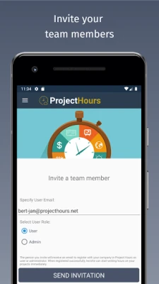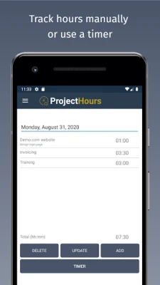 - Use a timer to register time. Timers run on the Project Hours server, no need to keep the app open while working.