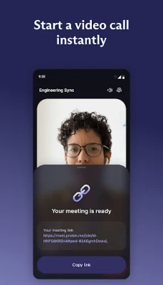 Start in seconds — Create a meeting room link and invite anyone, even if they don’t have a Proton Account or the Proton Meet app.