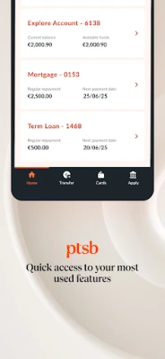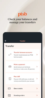 The PTSB app is a secure, fast and easy way to bank on the go. It offers a great range of features to make accessing your money and controlling your finances effortless, giving you the time and peace of mind to get on with your life!