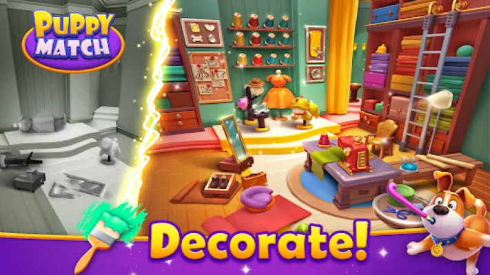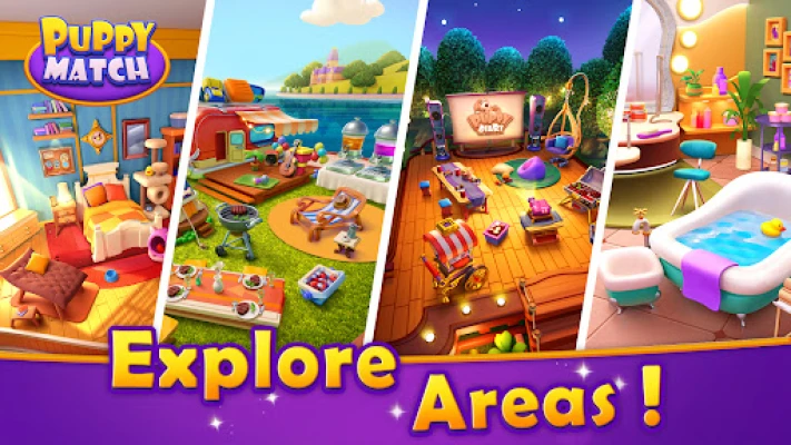 - Explore new rooms, and unlock new areas in Puppy Match. New areas will be unlocked after you pass match-3 levels.