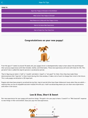 • Interactive Socialization Checklist – explore safe, age-appropriate experiences for your puppy.