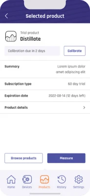 Fully new version of Purpl Pro Start a trial version for the new product "Distillate" See more details about the products and which equipment is required for measurements View the generated measurement spectrum and compare it to our average Rename your measurement for better tracking Delete unneeded measurements Request the account deletion from inside the app