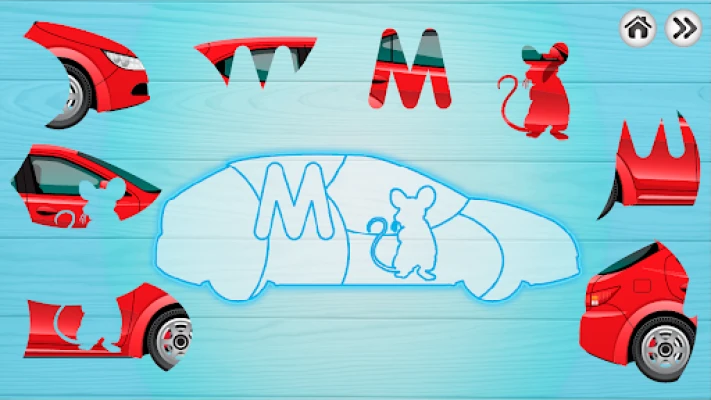 The game includes 39 slides with a picture of a car, divided into 8 parts, of which 2 pieces are made in the form of a number, a letter of the English alphabet, an animal or a transport vehicle.