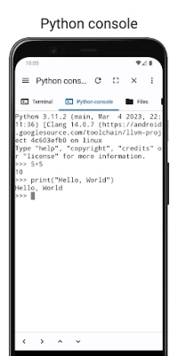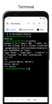 Terminal - Preinstalled python3 and python2 - Access the shell and commands that ship with android. - Support for tab and arrows even if the virtual keyboard lacks them.