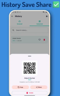 All scanned and generated QR codes are saved automatically in your local history. You can easily: