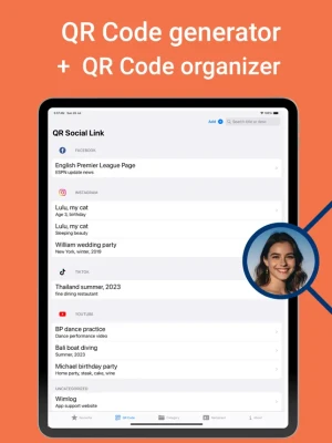 Generate and store QR codes for your social media URL link, or your web store page link. Organize them in different categories like contact list. In addition, this app can also generate QR code for your phone contact (vCard).