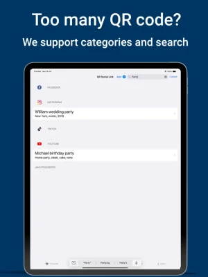 This app is design for simplicity, similar to mobile phone contact list. Nothing more, nothing less. Too many QR codes generated? QR codes can be organize, put under different categories and search by title or description.