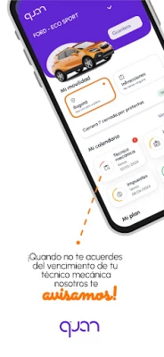 Con Quan, recibes notificaciones de pico y placa, comparendos, vencimientos de tu SOAT, revisión técnico-mecánica e impuestos, alteraciones de tránsito, próximos mantenimientos de tu vehículo, ¡y mucho más! Además, puedes solicitar asistencias viales, servicios especializados para ti y tu vehículo, y acceder a alianzas exclusivas en un solo lugar.