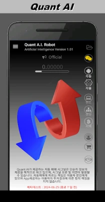 "Quant AI 투자봇" 자동분석 알고리즘에 의한 매매/매도 신호(시그널)을 회원에게 서비스 하는 것으로 해당 종목 챠트(5분, 10분, 30분, 60분, 일봉)와 함께 매매신호가 상하 화살표로 표시됩니다. 이용자는 수신된 신호의 적합성을 확인하고 해당 거래소에 직접 주문하게 됩니다. 당사 운영시스템은 매매신호 발생시점에 자율매매로 매매주문 및 체결이 이루어 지지만 이용자는 수동으로 거래소에 직접 주문해야하는 차이가 있습니다.