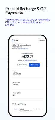 Track & Recharge – Tenants and owners log in to the Qube App to monitor usage and recharge prepaid balances.