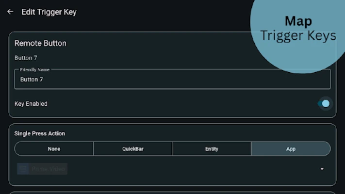 • Remote key actions: Map single, double, and long-press on your TV remote to open a QuickBar, toggle an entity, or launch another app.