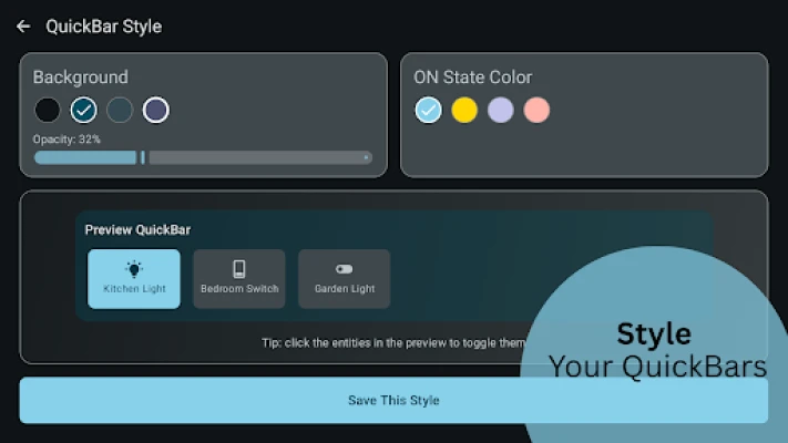 • Instant overlays (QuickBars): Launch an interactive sidebar over any app for tap-fast control of your favorite Home Assistant entities.