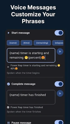 • Custom TTS messages for Start / Pause / Resume / Complete / Stop