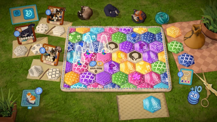 Quilts and Cats of Calico is a cozy board game in which the player's main task is to make a quilt from patterned fabric scraps. By smartly combining the colors and patterns of the scraps, the player can not only score points for the completed design but also sew on buttons and attract adorable cats, who have their own preferences for bedding patterns.