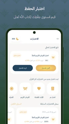 The Holy Quran Quiz module helps you evaluate your Quran memorization strength in any sura or juzu. and gives you a mark that reflects the strength of your memorization. You can manage your Quran memorization journey with the Quiz Tools, and also manage to keep your memorization very sharp and correct. Plus, you can take a quiz of the Whole Quran or the part that you memorize every month so that you test your memorization strength, and try to remedy any weakness that you may discover. You can also check the history of your quizzes and evaluate your progress over time.