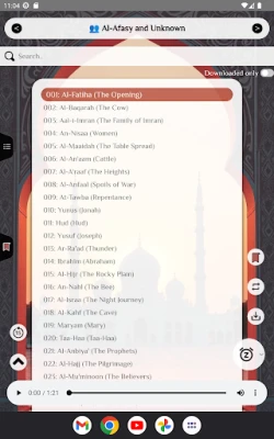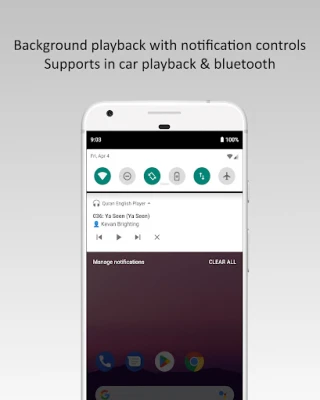 📴 Background playback: Listen with the screen off / app minimized. The currently playing Surah and media controls display in the notification bar & lock screen.