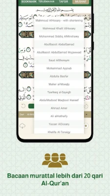 The Qur'anic verses in this application use the Indonesian Rasm Usmani Standard Mushaf by the Ministry of Religion c.q. Lajnah Pentashihan Mushaf Al-Qur'an. In addition to presenting the complete 30 juz of the Qur'anic text and pages of the Qur'an from three editions of the Qur'an (Kemenag, and the Madina version), this application is also equipped with several translations, and interpretations of the Quran.