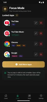 Add custom blocking times beyond the five daily prayers for extra focus sessions during Tahajjud, Quran study, or any time you choose.