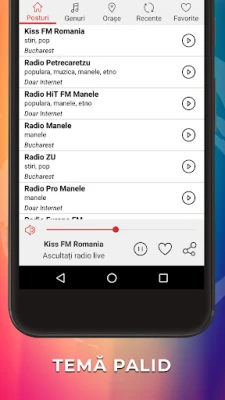 Puteți căuta în lista posturilor populare din România pe telefon folosind filtre precum genul sau orașul. Lista posturilor radio este sortată în funcție de popularitatea postului în aplicație. De îndată ce v-ați selectat postul favorit și ați apăsat play, aplicația va continua să funcționeze în fundal în timp ce sunteți liber să vă folosiți telefonul.