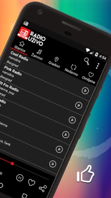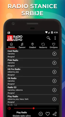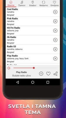 Popularne Srpske radio stanice u na vašem mobilnom telefonu možete da pretražujte po žanrovima ili po gradovima. Lista radio stanica se formira prema slušanosti u aplikaciji. Kada izaberite vašu omiljenu radio stanicu pustite je a aplikacija će ostati u pozadini dok vi radite bilo šta drugo na vašem telefonu.