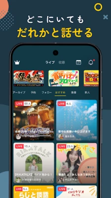リアルタイムで配信者(トーカー)と視聴者(リスナー)が楽しめるライブ配信、歌や弾き語り、声劇などの音声を残せる収録配信など、あなたのスタイルにあった音声配信をお楽しみください!