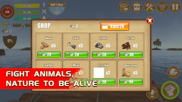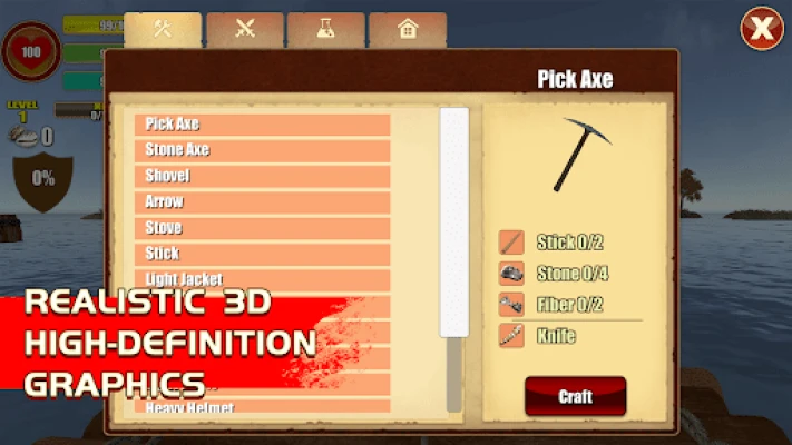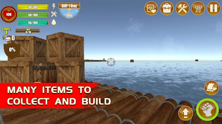 You must overcome hunger and thirst in the endless ocean. Escape from unknown threats on a floating raft. Collect useful resources to produce and improve buildings, and make various armor and weapons to protect oneself from intruders