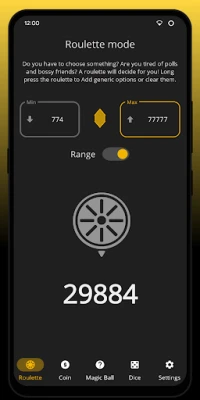 The main purpose of the app is to provide a random choice in different ways. The app contains some basic personalization options and an introduction, plus some new resources like animated vector drawables and a basic Material You support. The design is a bit personal: it follows the Android guidelines, but not totally.