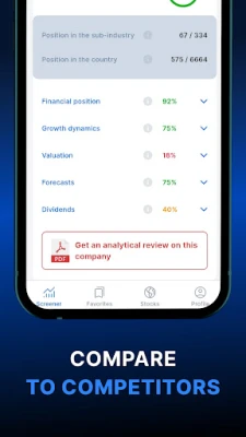 - Financial position and business growth - an assessment of the financial position and growth of the business. Profitability metrics (ROA, ROE, Net Margin), debt load (Net Debt / EBITDA, Debt / Equity), liquidity (Quick ratio, Current ratio), free cash flow, etc. are analyzed. In addition, growth rates of revenue, profit, assets , equity capital of companies are analyzed.