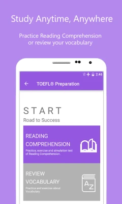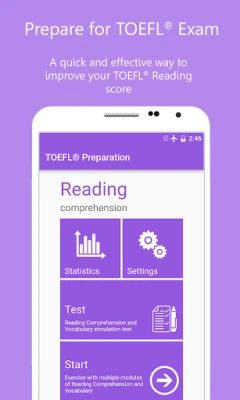 This simple app can help you to get a better score in the TOEFL® test. This application focus on Reading Comprehension part. It helps you practice 'reading comprehension' whenever and wherever you are. You can test your skill in 'Part A: Vocabulary' or 'Part B: Reading Comprehension' and then check whether your answer is correct or wrong. If you think you are ready, you can test your reading skill by jump into the simulation test.