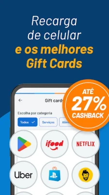 🎁 Até 27% de cashback em Gift Cards e 4% em TV Pré-paga