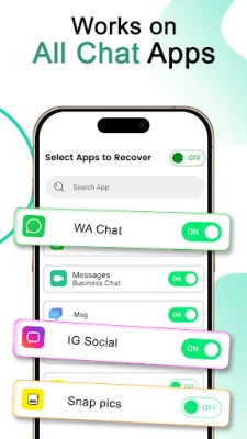 - Choose which apps to track - Enable message saving only for apps you select; all toggles default to OFF.