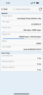 - PLC type and status, such as PLC Error Logs, scan times (Min and Max), as well as Project file information.