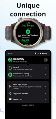Premium version of Remotify enables you to manage your favorite songs in Spotify app and start playback of song or playlist right from your Amazfit smart watch.