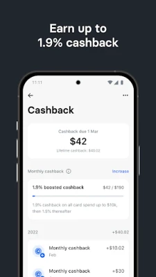 - Earn up to 1.9% cashback on card purchases