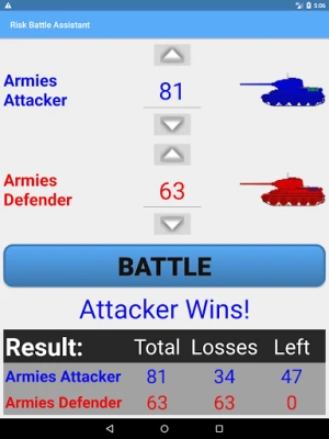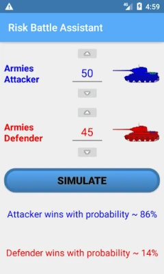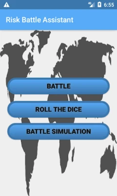 Features: - Battle: do a fast battle after entering attacker and defender numbers - Roll the Dice: completely fair, no physical dice needed - Battle Simulation: calculates winning probabilities of attacker and defender while simulating thousands of battles