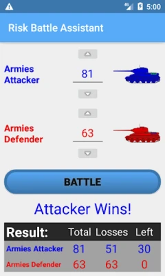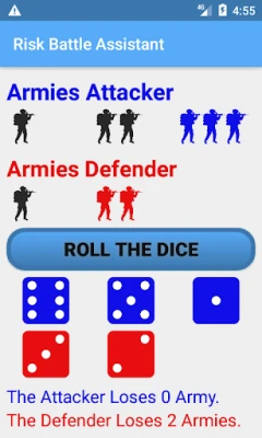 Playing Risk and rolling the dices is fun. But often battles and games are tough because of very long time rolling the dices. This is the idea behind the Risk Battle Assistant, to shorten up battle times and increase gaming fun. You only must enter attacker and defender numbers and the app does the rest. The app provides several features and functionality in context of Risk Game.